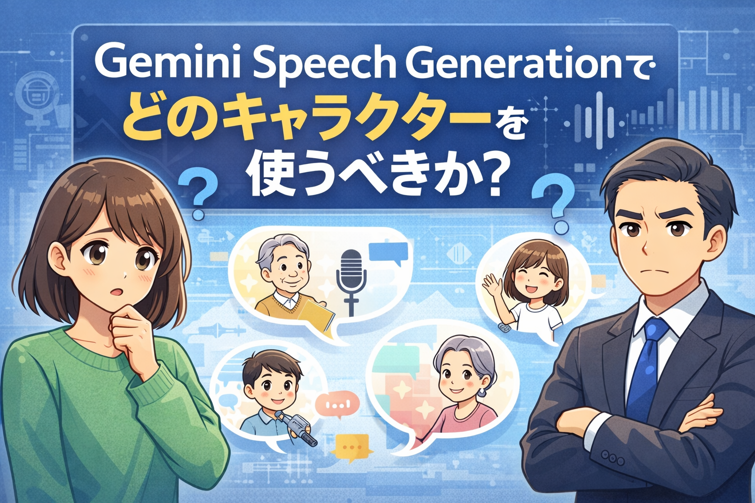- Gemini Speech Generation は直接「キャラクター名」ではなく「音声スタイルや性別・声色」を指定する形式が多いです。